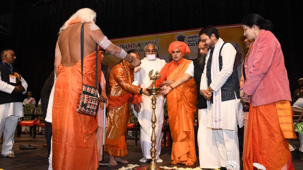 The programme commenced with the ceremonial lighting of the lamp by Swami Chakrapani and other spiritual leaders, followed by a devotional Ganesh Vandana that set a serene and spiritual tone for the event.
